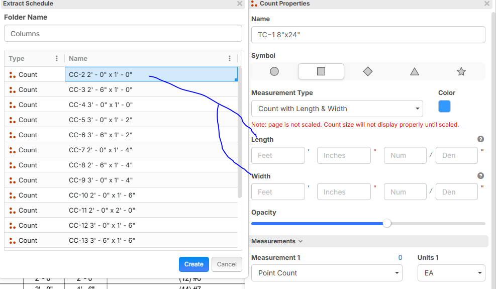 (Below image illustrates how I would like to see an enhancement to the Extract Schedule tool to create counts with length & width measurements filled in. Would be huge time saver when you have massive schedules)