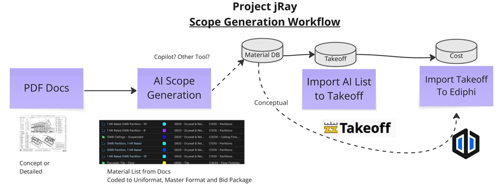 Yeah you nailed the dream, we got a proof of concept working to the takeoff level. Need to get to import both takeoffs and items per your comment. We are kicking around the below dream workflow and hoping to do that via a import.....The future is coming fast.