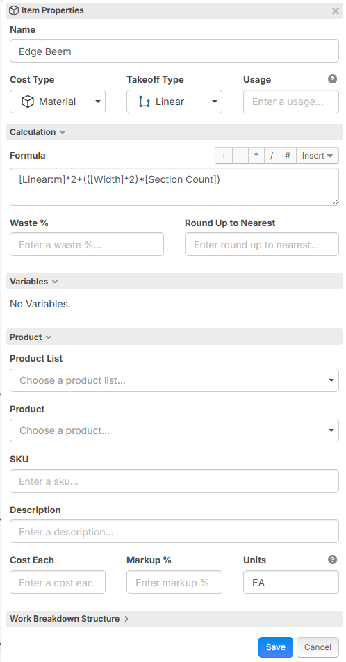 Further to our Meeting You Measure Footings using the Linear with Width and you currently calculte the Perimeter for Edge Board using the Formula [Linear:m]*2+(([Width]*2)*[Section Count]) (as there is no built in option) using the centre line to achieve the correct calculation especially when there are multiple sections.