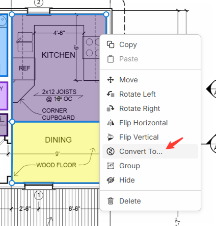 We are working on a "Convert to..." option in the right click menu, either on the "takeoff item" from the sidebar or the "takeoff measurement" on the page. Our thinking is this will show a popup with multiple purposes: