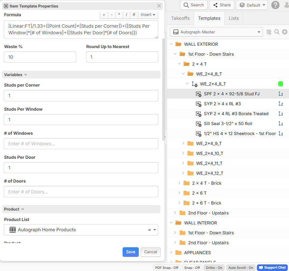 This is what I do. I created variables in my formula where I can add studs per Window or Door Opening* Number of Window and Door Openings in wall. I can also change the Studs Per Corner per Point Click. So I take all the 8' walls off and then count my openings and plug them into my Stud Variables and it adds it to the LF/1.33 for 16" on center spacing for the Wall Studs. This will give me my Stud Count for the Wall + Openings Stud Count + Studs per Corner. I also have my Cost Code and Item number added per material so I can quickly export a report where I can copy and paste into my ERP Import. It will good when Heber and team have the API's available where we can map the Report Columns to the ERP Import and save even more time.
