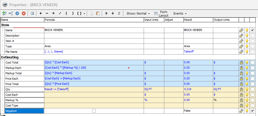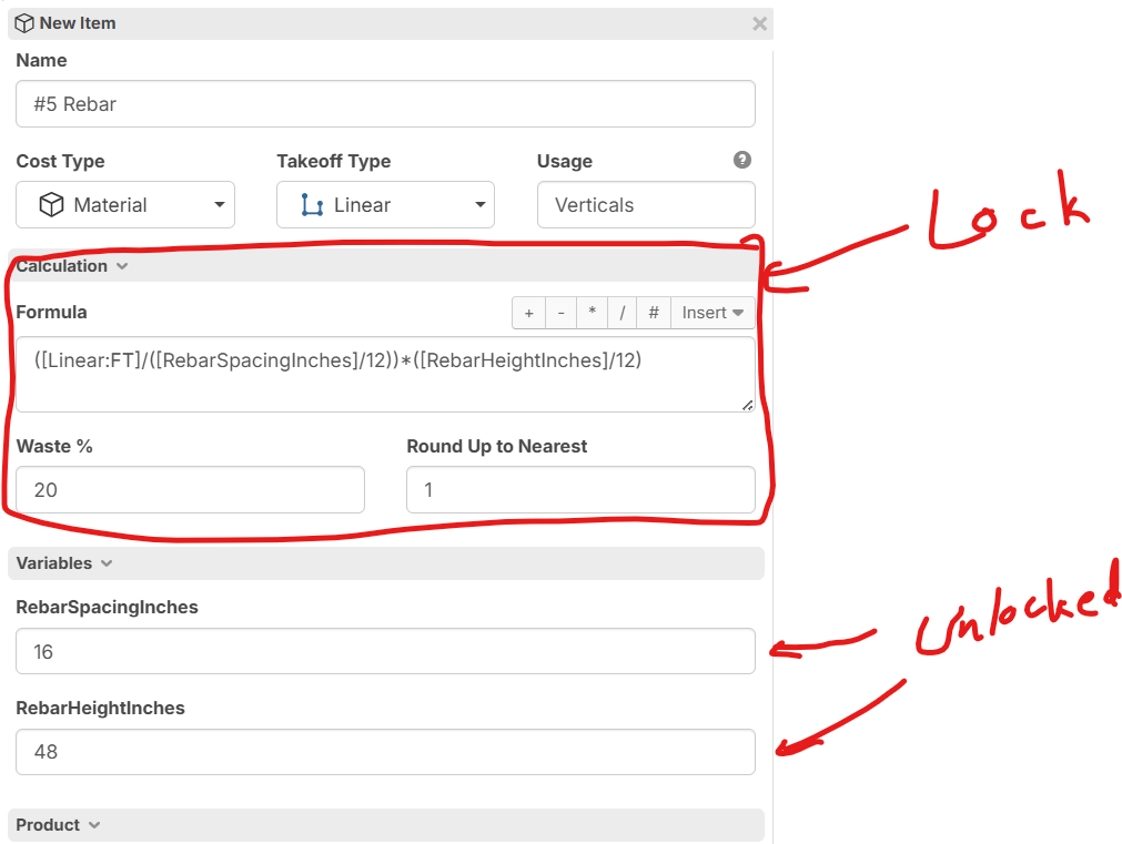 The takeoff side of zz is exceptional but we have to have locks and permissions of some sort prior to rolling out full blown zz estimating. I'd like something like planswift's locking feature but it could be something as simple as lock the calculations and if a piece needs to be a variable that the estimator can modify, create it as a variable but still lock the formula. Example below.